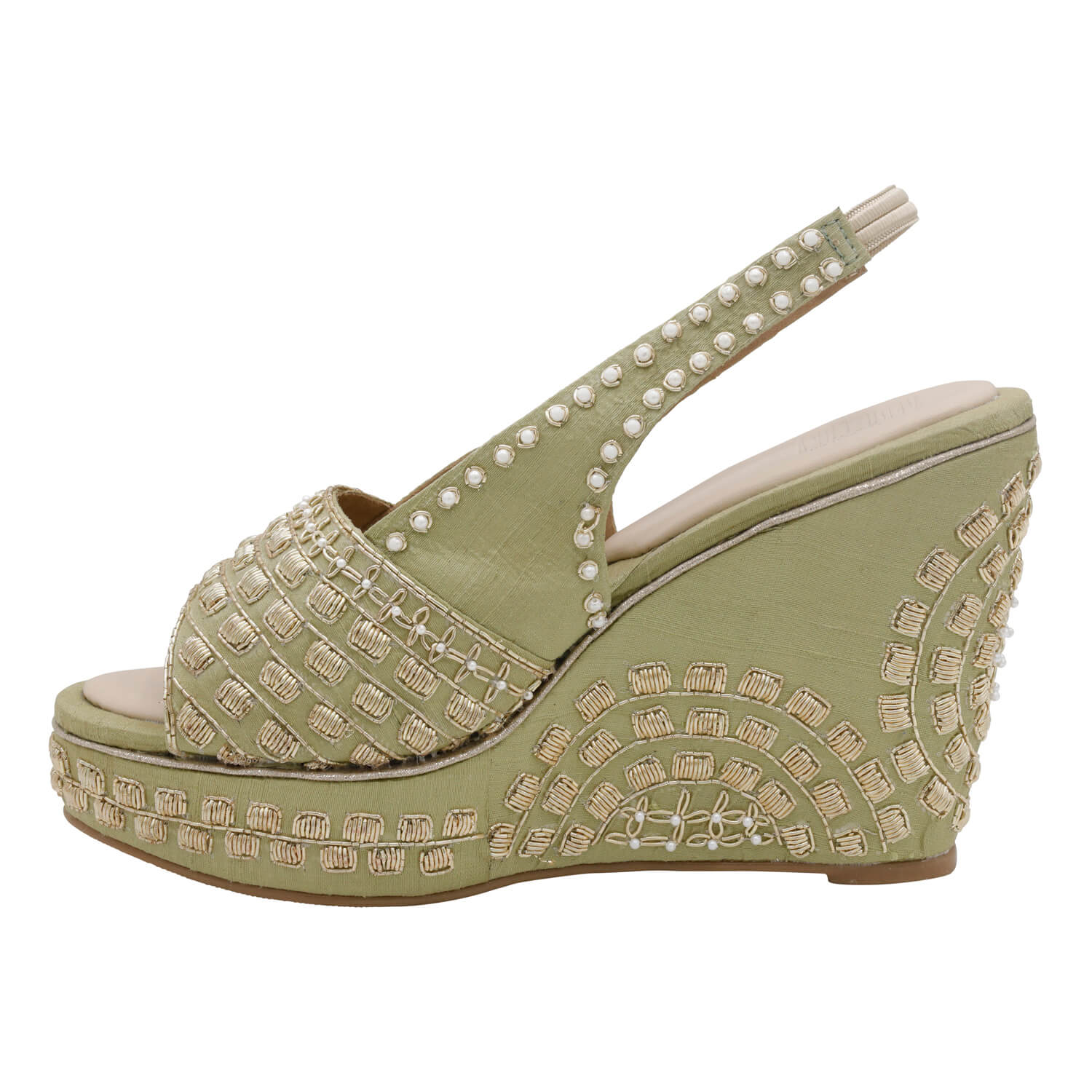 Make the crowd go green with envy as you sashay all the way in these sage rawsilk peeptoes. Accentuated with gold zardozi and pearls, these lovelies will be with you in every walk of life.